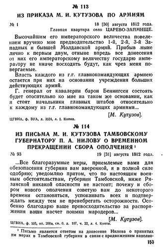 Из письма М. И. Кутузова тамбовскому губернатору П. А. Нилову о временном прекращении сбора ополчения. 19 [31] августа 1812 года // ЦГВИА, ф. 103, оп. 208а, св. 0, д. 107, ч. 22, л. 4. Копия.