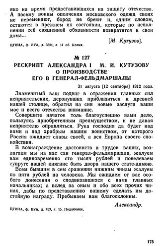 Рескрипт Александра I М. И. Кутузову о производстве его в генерал-фельдмаршалы. 31 августа [12 сентября] 1812 года // ЦГВИА, ф. ВУА, д. 453, л. 15. Подлинник.
