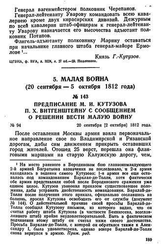 Предписание М. И. Кутузова П. X. Витгенштейну с сообщением о решении вести малую войну. 20 сентября [2 октября] 1812 года