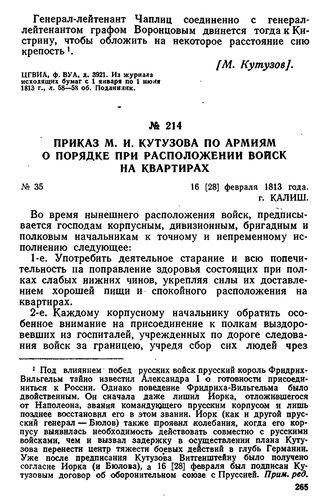 Приказ М. И. Кутузова по армиям о порядке при расположении войск на квартирах. 16 [28] февраля 1813 года, г. Калиш