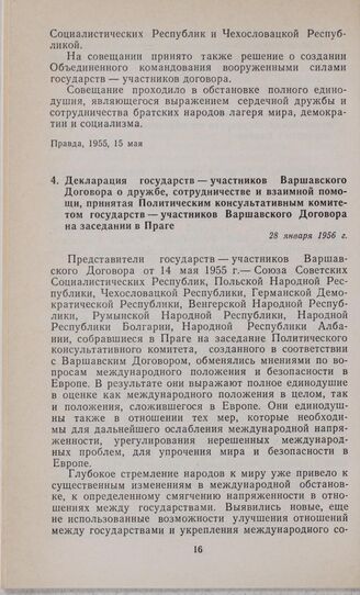 Декларация государств — участников Варшавского Договора о дружбе, сотрудничестве и взаимной помощи, принятая Политическим консультативным комитетом государств — участников Варшавского Договора на заседании в Праге. 28 января 1956 г.