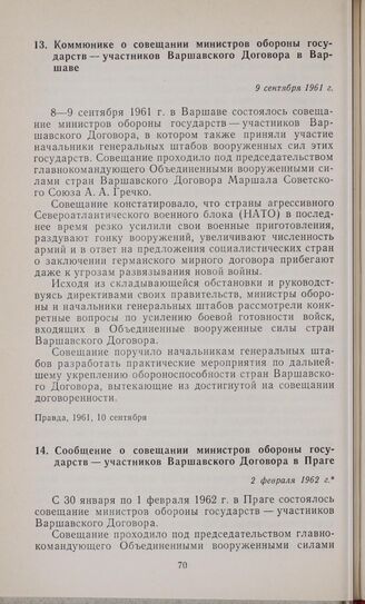 Сообщение о совещании министров обороны государств — участников Варшавского Договора в Праге. 2 февраля 1962 г. // Правда, 1962, 2 февраля.
