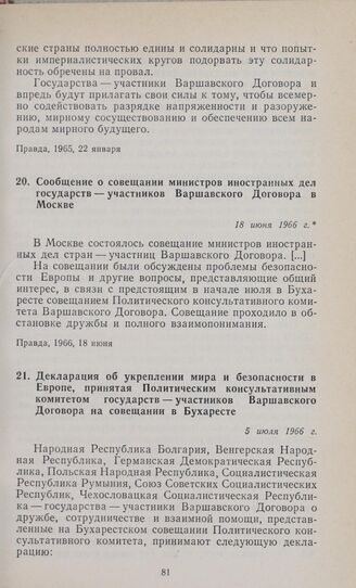Сообщение о совещании министров иностранных дел государств — участников Варшавского Договора в Москве. 18 июня 1966 г. // Правда, 1966, 18 июня.