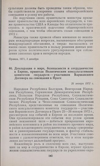 Декларация о мире, безопасности и сотрудничестве в Европе, принятая Политическим консультативным комитетом государств — участников Варшавского Договора на совещании в Праге. 26 января 1972 г.