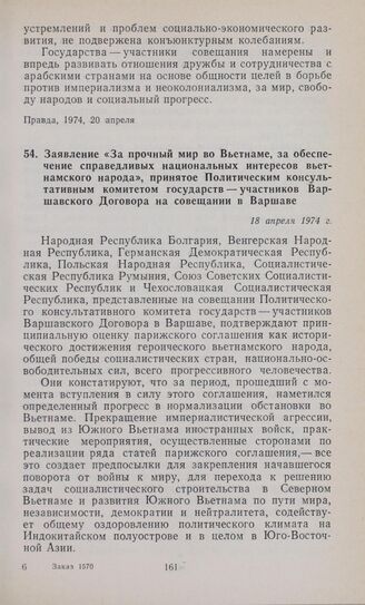 Заявление «За прочный мир во Вьетнаме, за обеспечение справедливых национальных интересов вьетнамского народа», принятое Политическим консультативным комитетом государств — участников Варшавского Договора на совещании в Варшаве. 18 апреля 1974 г.
