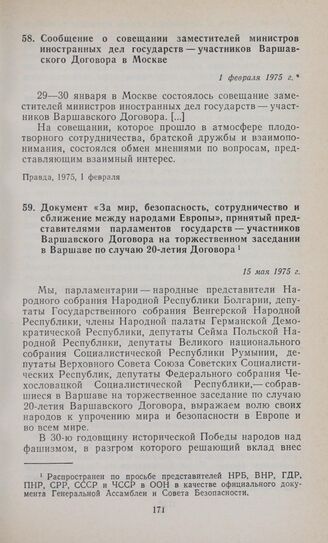 Документ «За мир, безопасность, сотрудничество и сближение между народами Европы», принятый представителями парламентов государств — участников Варшавского Договора на торжественном заседании в Варшаве по случаю 20-летия Договора. 15 мая 1975 г.