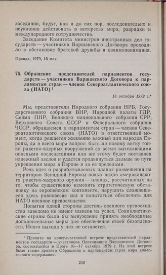 Обращение представителей парламентов государств — участников Варшавского Договора к парламентам стран — членов Североатлантического союза (НАТО). 18 октября 1979 г.