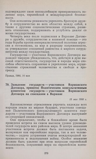 Заявление государств — участников Варшавского Договора, принятое Политическим консультативным комитетом государств — участников Варшавского Договора на совещании в Варшаве. 15 мая 1980 г. // Правда, 1980, 16 мая.