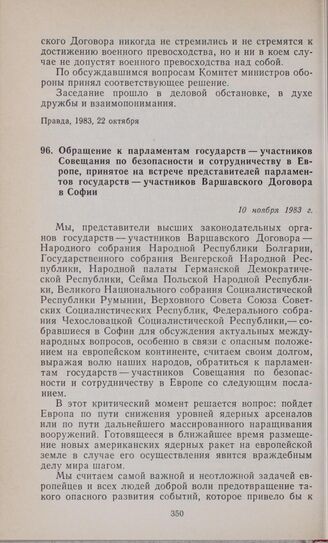 Обращение к парламентам государств — участников Совещания по безопасности и сотрудничеству в Европе, принятое на встрече представителей парламентов государств — участников Варшавского Договора в Софии. 10 ноября 1983 г. // Правда, 1983, 13 ноября.