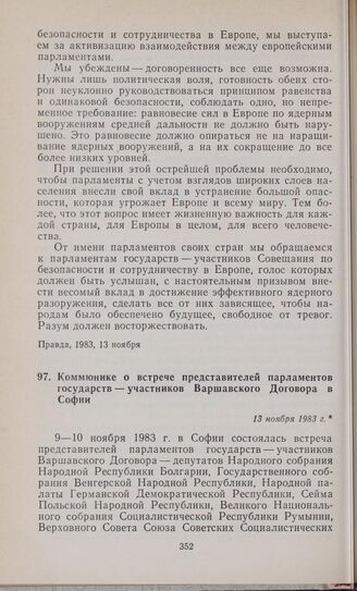 Коммюнике о встрече представителей парламентов государств — участников Варшавского Договора в Софии. 13 ноября 1983 г. // Правда, 1983, 13 ноября.