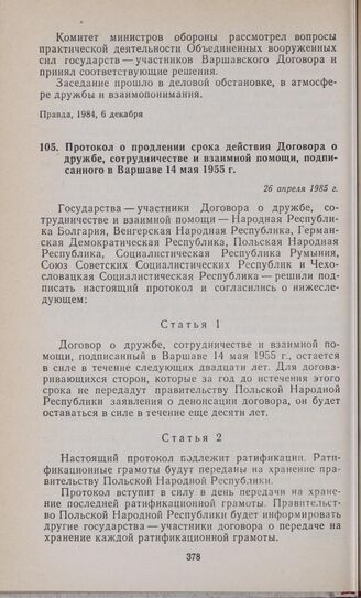 Протокол о продлении срока действия Договора о дружбе, сотрудничестве и взаимной помощи, подписанного в Варшаве 14 мая 1955 г. 26 апреля 1985 г. // Правда, 1985, 27 апреля.