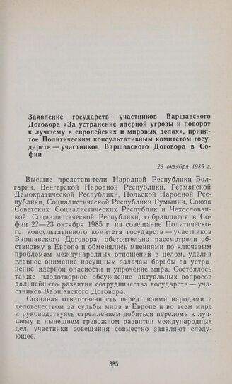 Заявление государств — участников Варшавского Договора «За устранение ядерной угрозы и поворот к лучшему в европейских и мировых делах», принятое Политическим консультативным комитетом государств — участников Варшавского Договора в Софии. 23 октября 1985 г. // Правда, 1985, 24 октября.