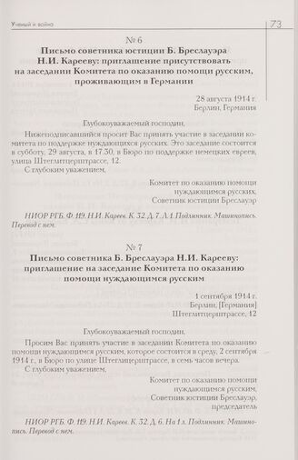 Письмо советника юстиции Б. Бреслауэра Н.И. Карееву: приглашение присутствовать на заседании Комитета по оказанию помощи русским, проживающим в Германии. 28 августа 1914 г. Берлин, Германия