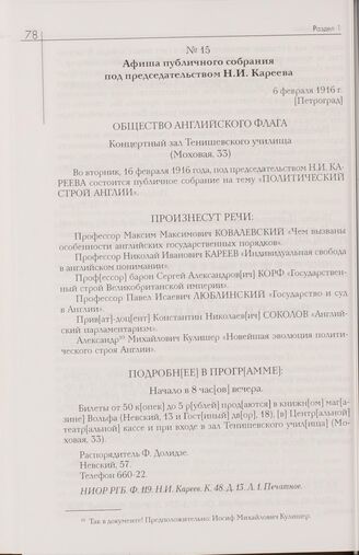Афиша публичного собрания под председательством Н.И. Кареева. 6 февраля 1916 г. [Петроград] // НИОР РГБ. Ф. 119. Н.И. Кареев. К. 48. Д. 1З. Л. 1. Печатное.