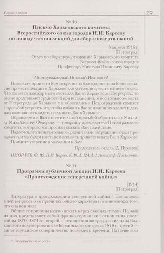 Письмо Харьковского комитета Всероссийского союза городов Н.И. Карееву по поводу чтения лекций для сбора пожертвований. 8 апреля 1916 г. [Петроград] // НИОР РГБ. Ф. 119. Н.И. Кареев. К. 10. Д. 124. Л. 1. Автограф. Подлинник.