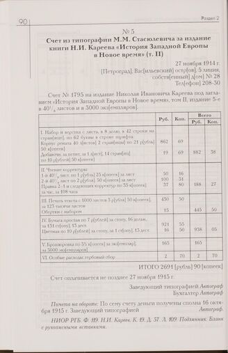 Счет из типографии М.М. Стасюлевича за издание книги Н.И. Кареева «История Западной Европы в Новое время» (т. II). 27 ноября 1914 г. [Петроград]