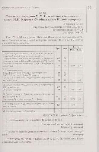 Счет из типографии М.М. Стасюлевича за издание книги Н.И. Кареева «Учебная книга Новой истории». 15 декабря 1915 г. Петроград