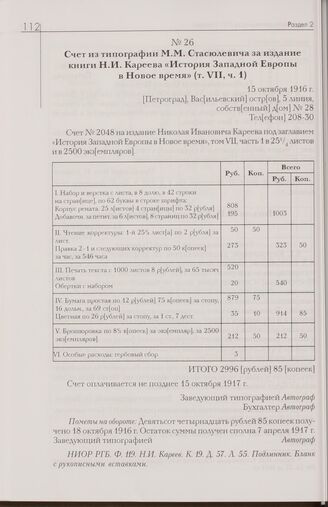 Счет из типографии М.М. Стасюлевича за издание книги Н.И. Кареева «История Западной Европы в Новое время» (т. VII, ч. 1). 15 октября 1916 г. [Петроград] // НИОР РГБ. Ф. 119. Н.И. Кареев. К. 19. Д. 57. Л. 55. Подлинник. Бланк с рукописными вставками.
