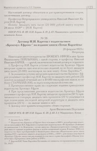 Договор Н.И. Кареева с издательством «Брокгауз-Ефрон» на издание книги «Томас Карлейль». 20 февраля 1923 г. Петроград