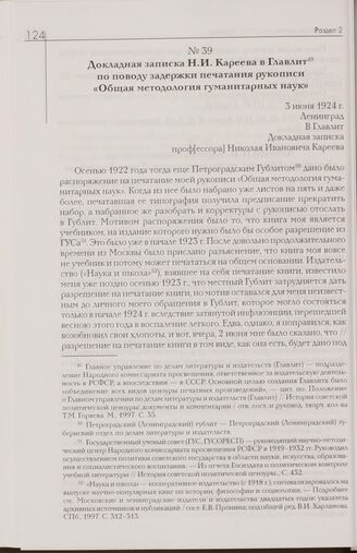 Докладная записка Н.И. Кареева в Главлит по поводу задержки печатания рукописи «Общая методология гуманитарных наук». 3 июня 1924 г. Ленинград // НИОР РГБ. Ф. 119. Н.И. Кареев. К. 19. Д. 36. Л. 1-2. Автограф. Подлинник. Опубл.: Из истории издания работы Н.И. Кареева «Общая методология гуманитарных наук», 1922-1924 гг. / подгот. Долгова Е.А. // Вестник архивиста. 2012. № 1. С. 242-243.
