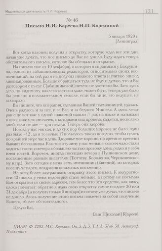 Письмо Н.И. Кареева Н.П. Корелиной. 5 января 1929 г. [Ленинград]
