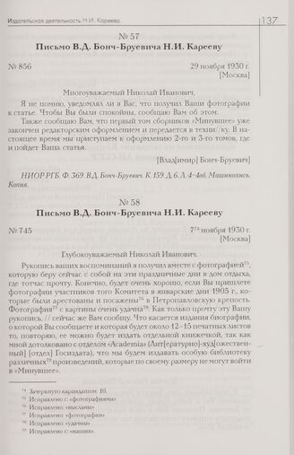 Письмо В.Д. Бонч-Бруевича Н.И. Карееву. 29 ноября 1930 г. [Москва] // НИОР РГБ. Ф. 369. В.Д. Бонч-Бруевич. К. 159. Д. 6. Л. 4-4об. Машинопись. Копия.