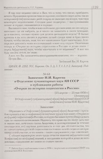 Заявление Н.И. Кареева в Отделение гуманитарных наук АН СССР о публикации работы «Очерки по истории социологии в России». [25 апреля — 25 мая 1930 г.] [Ленинград]