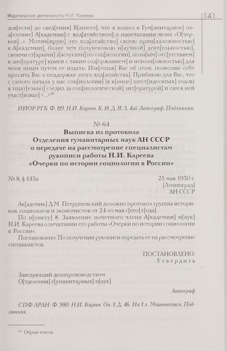 Выписка из протокола Отделения гуманитарных наук АН СССР о передаче на рассмотрение специалистам рукописи работы Н.И. Кареева «Очерки по истории социологии в России». 25 мая 1930 г. [Ленинград] // СПФ АРАН. Ф. 980. Н.И. Кареев. Оп. 1. Д. 46. На 1 л. Машинопись. Подлинник.