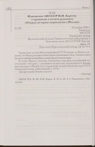 Извещение АН СССР Н.И. Карееву о принятии к печати рукописи «Очерки истории социологии в России». 19 ноября 1930 г. Ленинград