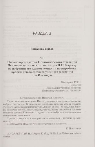 Письмо председателя Педагогического отделения Психоневрологического института Н.И. Карееву об избрании его членом комиссии по выработке проекта устава среднего учебного заведения при Институте. 18 февраля 1916 г. Петроград // НИОР РГБ. Ф. 119. Н.И. Кареев К. 47. Д. 14. На 2 лл. Подлинник. Машинопись.