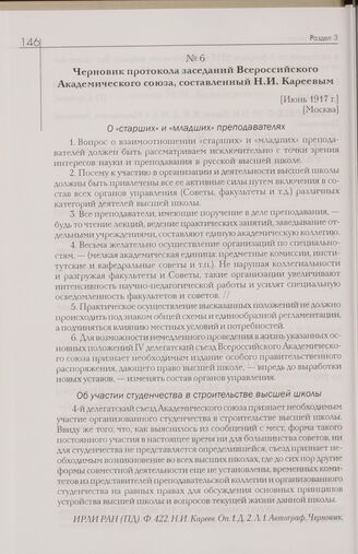 Черновик протокола заседаний Всероссийского Академического союза, составленный Н.И. Кареевым. [Июнь 1917 г.] [Москва] // ИРЛИ РАН (ПД). Ф. 422. Н.И. Kapeeв. Оп. 1. Д. 2. Л. 1. Автограф. Черновик.