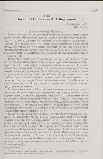Письмо Н.И. Кареева Н.П. Корелиной. 1 сентября 1923 г. [Петроград]