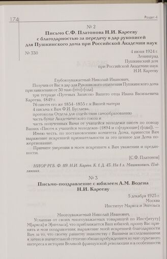 Письмо С.Ф. Платонова Н.И. Карееву с благодарностью за передачу в дар рукописей для Пушкинского дома при Российской Академии наук. 4 июня 1924 г. Ленинград