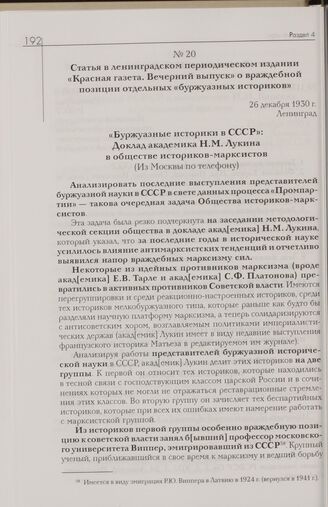 Статья в ленинградском периодическом издании «Красная газета. Вечерний выпуск» о враждебной позиции отдельных «буржуазных историков». 26 декабря 1930 г. Ленинград