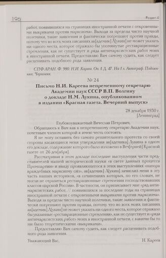 Письмо Н.И. Кареева непременному секретарю Академии наук СССР В.П. Волгину о докладе Н.М. Лукина, опубликованном в издании «Красная газета. Вечерний выпуск». 28 декабря 1930 г. [Ленинград]