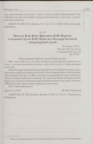 Письмо В.Д. Бонч-Бруевича К.Н. Карееву о передаче бумаг Н.И. Кареева в Государственный литературный музей. 19 ноября 1935 г. Москва-Волоколамск // НИОР РГБ. Ф. 369. В.Д. Бонч-Бруевич. К. 159. Д. 5. На 1 л. Машинопись. Подлинник.