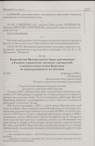 Ходатайство Центрального бюро краеведения в Главное управление научных учреждений о невыселении семьи Кареевых из принадлежащего им имения. 18 февраля 1926 г. [Ленинград] // ГА СО. Ф. Р-1З. Исполнительный комитет Смоленского губернского совета рабочих, крестьянских и красноармейских депутатов. Оп. 6. Д. 33. Л. 58-59. Машинопись. Подлинник.