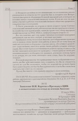 Заявление В.И. Кареева в Президиум ЦИК о невыселении его семьи из имения Аносово. 22 марта 1926 г. Смоленск // ГА СО. Ф. Р-13. Исполнительный комитет Смоленского губернского совета рабочих, крестьянских и красноармейских депутатов. Оп. 6. Д. 33. Л. 71-71об. Автограф. Подлинник.