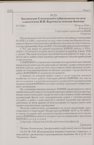 Заключение Смоленского губисполкома по делу о выселении В.И. Кареева из имения Аносово. 22 июля 1926 г. [Смоленск] // ГА СО. Ф. Р-13. Исполнительный комитет Смоленского губернского совета рабочих, крестьянских и красноармейских депутатов. Оп. 6. Д. 33. Л. 6. Машинопись. Копия.