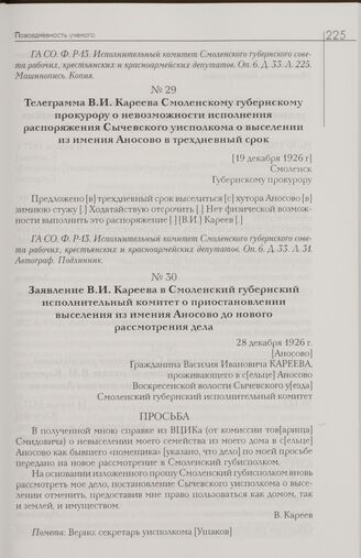 Заявление В.И. Кареева в Смоленский губернский исполнительный комитет о приостановлении выселения из имения Аносово до нового рассмотрения дела. 28 декабря 1926 г. [Аносово] // ГА СО. Ф. Р-13. Исполнительный комитет Смоленского губернского совета рабочих, крестьянских и красноармейских депутатов. Оп. 6. Д. 33. Л. 230. Машинопись. Копия с копии.