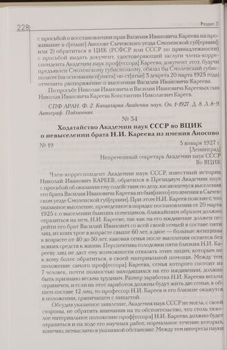 Ходатайство Академии наук СССР во ВЦИК о невыселении брата Н.И. Кареева из имения Аносово. 5 января 1927 г. [Ленинград] // ГА СО. Ф. Р-13. Исполнительный комитет Смоленского губернского совета рабочих, крестьянских и красноармейских депутатов. Оп. 6. Д. 33. Л. 25-25об. Машинопись. Подлинник.