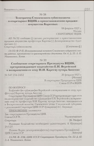 Телеграмма Смоленского губисполкома в секретариат ВЦИК о приостановлении продажи имущества Кареевых. 48 февраля 1927 г. Москва // ГА СО. Ф. Р-13. Исполнительный комитет Смоленского губернского совета рабочих, крестьянских и красноармейских депутатов. Оп. 6. Д. 33. Л. 13. Машинопись. Копия.