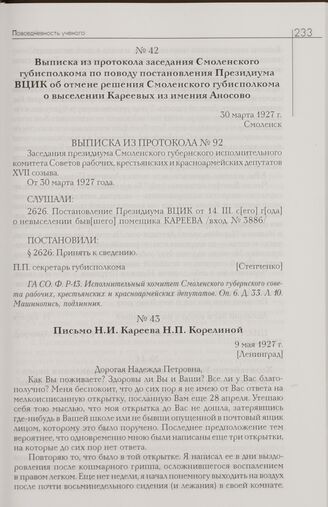 Письмо Н.И. Кареева Н.П. Корелиной. 9 мая 1927 г. [Ленинград] // ЦИАМ. Ф. 2202. М.С Корелин. Оп. 3. Д. 3. Т 1. Л. 35-36. Автограф. Подлинник.