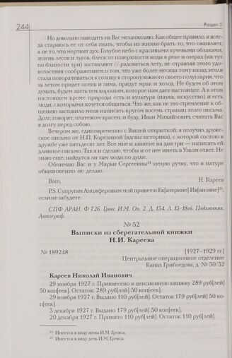 Выписки из сберегательной книжки Н.И. Кареева. [1927-1929 гг.] // НИОР РГБ. Ф. 119. Н.И. Кареев. К. 18. Д. 78. Л. 23-27об. Машинопись с рукописными пометками. Подлинник.
