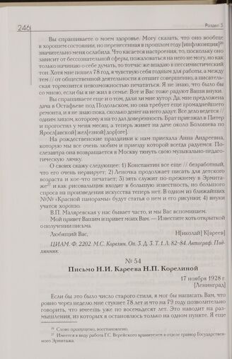 Письмо Н.И. Кареева Н.П. Корелиной. 17 ноября 1928 г. [Ленинград] // ЦИАМ. Ф. 2202. М.С. Корелин. Оп. 3. Д. 3. Т. 1. Л. 136-136об. Автограф. Подлинник.