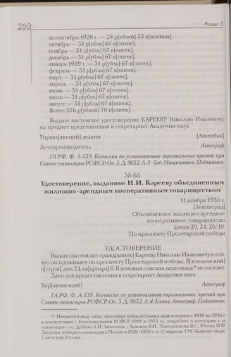 Удостоверение, выданное Н.И. Карееву объединенным жилищно-арендным кооперативным товариществом. 11 ноября 1930 г. [Ленинград] // ГА РФ. Ф. А-539. Комиссия по установлению персональных премий при Совете министров РСФСР. Оп. 3. Д. 9032. Л. 4. Бланк. Автограф. Подлинник.