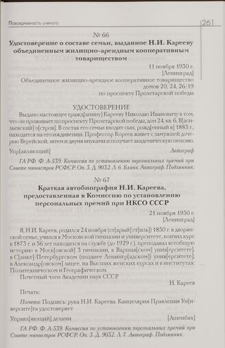 Удостоверение о составе семьи, выданное Н.И. Карееву объединенным жилищно-арендным кооперативным товариществом. 11 ноября 1930 г. [Ленинград] // ГА РФ. Ф. А-539. Комиссия по установлению персональных премий при Совете министров РСФСР. Оп. 3. Д. 9032. Л. 6. Бланк. Автограф. Подлинник.