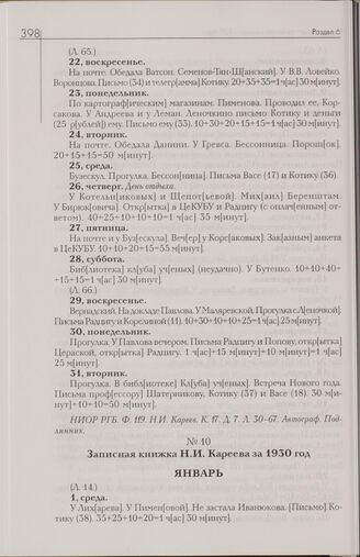 Записная книжка Н.И. Кареева за 1930 год // НИОР РГБ. Ф. 119. Н.И. Кареев. К17. Д. 7. Л. 14-30. Автограф. Подлинник.