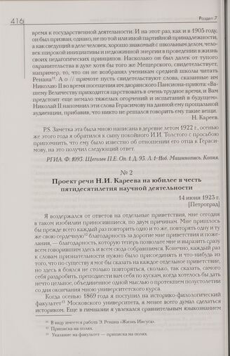 Проект речи Н.И. Кареева на юбилее в честь пятидесятилетия научной деятельности. 14 июня 1923 г. [Петроград]
