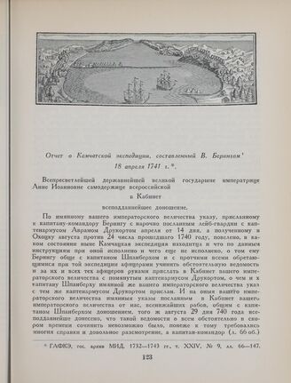 Отчет о Камчатской экспедиции, составленный В. Берингом. 18 апреля 1741 г. // ГАФКЭ, гос. архив МИД, 1732-1743 гг., т. XXIV, № 9, лл. 66-147.